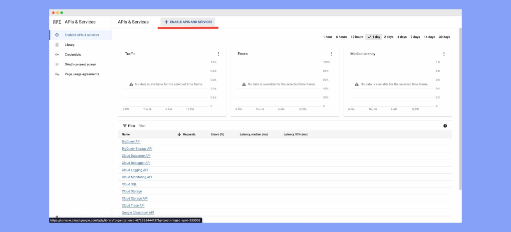 Step 3: From the Dashboards, click Enable APIs and Services.