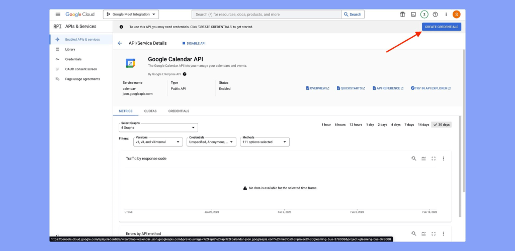 Step 6: Then, from the Google Calendar API dashboard, click on Create Credentials.