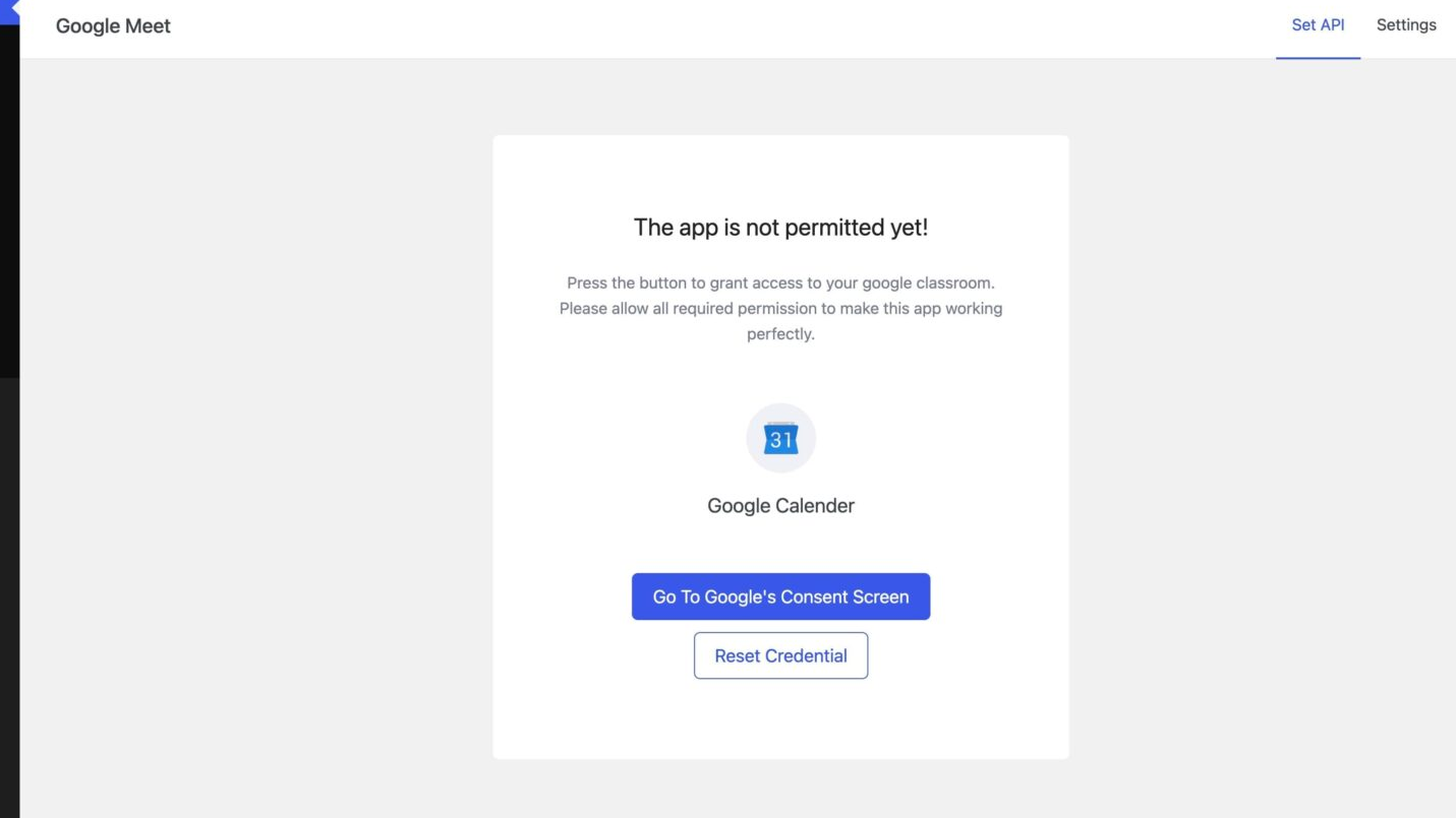 To find this button, head over to Tuition Near Me > Google Meet > Set API. After clicking on Reset Credential, your currently connected Meet Account will get invalidated.