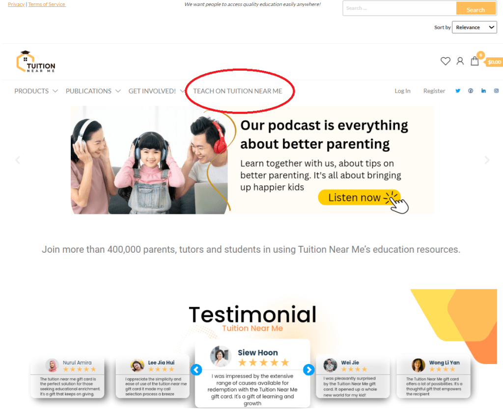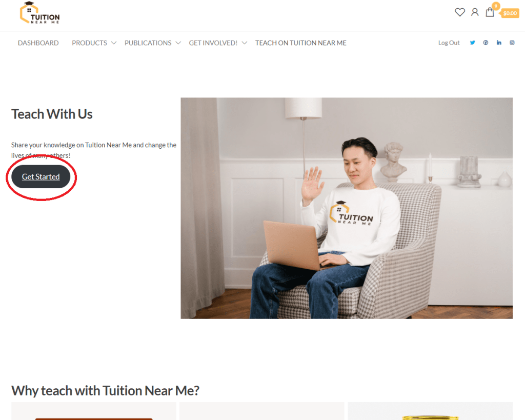 1st Step) Visit the Tuition Near Me’s website at www.TuitionNearMe.org and click on “Teach on Tuition Near Me” located at the top of the website.