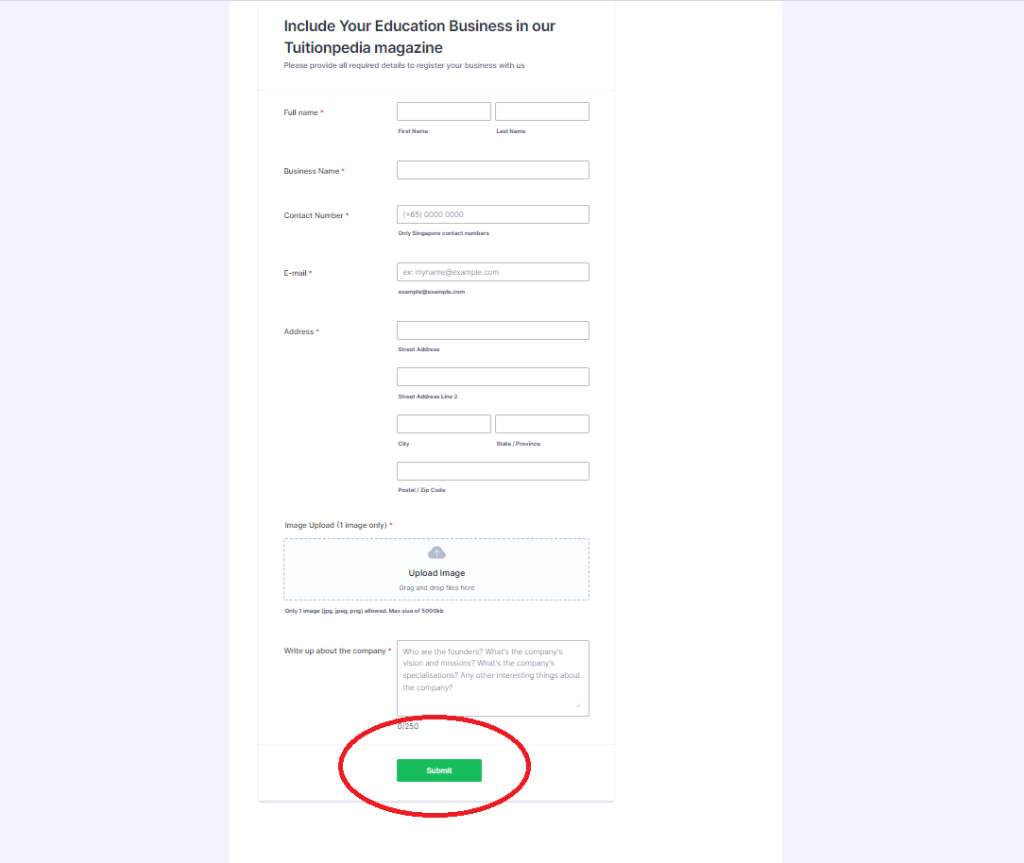 7th Step) Now, you will be able to submit your company details to the Tuitionpedia magazine for consideration. Complete the details required and click on the button “Submit” to complete the process.