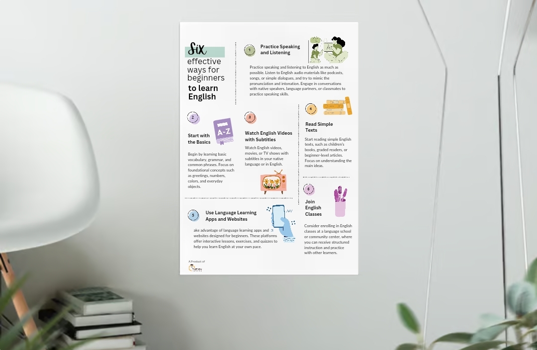 This poster is designed to provide six effective ways for beginners to learn English. With vibrant and engaging visuals, it’s not only educational but also spruces up the classroom environment.