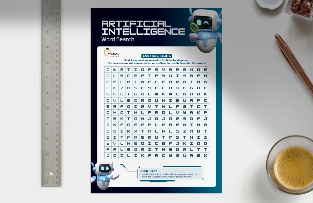 Introducing our new Tuition Near Me education product – the Artificial Intelligence Word Search! This beautifully designed activity book features a 1-page word search filled with artificial intelligence terms, a 1-page set of clues to help young learners, and a 1-page answer key for easy reference.